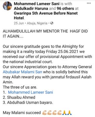 “Our sincere gratitude goes to the Almighty for making it a reality. Today Friday, 25.06.2021, we received our offer of provisional appointment with the national industrial court,” Mr Gado wrote.